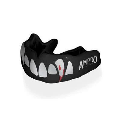 Ampro Custom Dentist Performance Black Mouth Guard – White Vampire Fangs. Black Professional Mouth Guard, with a black coloured inner, and the Vampire blood fangz design to the front and small Ampro logo on side. Scientifically tested and Bespoke made at 5mm for ultimate comfort and maximum protection, these professional gumshields are the ultimate for protection in contact sports. Custom Fit and completely hand made by dentists, they are finished to fit your teeth and gums exact, making your Ampro dental mouth guard not only comfortable, but it will not make you gag. Made in England.
