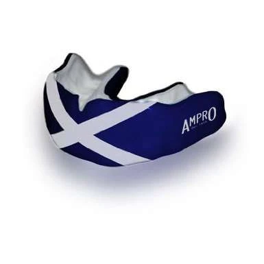 Ampro Custom Dentist Performance Flag Mouth Guard – Scotland. Blue Professional Mouth Guard, with a White coloured inner. Features the Scotish St Andrews Cross flag design to the front and small Ampro logo on side. Scientifically tested and Bespoke made at 5mm for ultimate comfort and maximum protection, these professional gumshields are the ultimate for protection in contact sports. Custom Fit and completely hand made by dentists, they are finished to fit your teeth and gums exact, making your Ampro dental mouth guard not only comfortable, but it will not make you gag. Made in England.