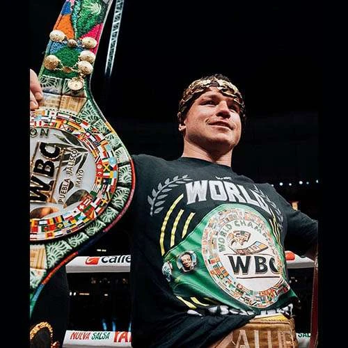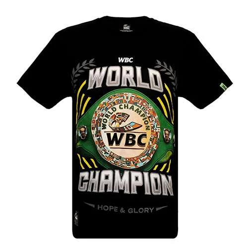 Introducing the new official WBC Championship Belt T-shirt, now available in black. This classic-fit tee is crafted from lightweight and durable cotton fabric, providing all-day comfort. Featuring short sleeves, the shirt showcases the iconic WBC branding, complete with a belt design on the chest and back, as well as the WBC logo on the sleeve.
